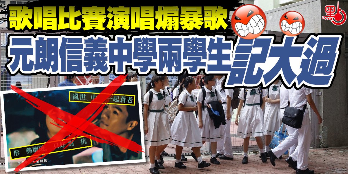 大公文匯全媒體報道:基督教香港信義會元朗信義中學近日舉辦校內歌唱比賽,兩名學生特意揀選歌詞涉「亂世」、「對抗」等政治暗示字眼的歌曲參賽,又在初賽一度以同曲改詞的版本避開校方把關,到決賽時卻突然唱回原版,其中一人唱畢後更高呼「黃絲」政治口號,煽動現場情緒。兩名學生在比賽後被老師訓話,被校方給予記大過處分,並限制其不能代表學校參與校外比賽或活動。教育局回覆表示,正就事件向學校了解,並會繼續與學校保持聯繫。局方重申學校是學生學習的地方,不應作為表達政治訴求的場地,學校有責任培育學生的品德,面對行為甚至價值觀有偏差的學生,學校有責任加強訓輔工作,匡扶他們建立良好的品格和行為。