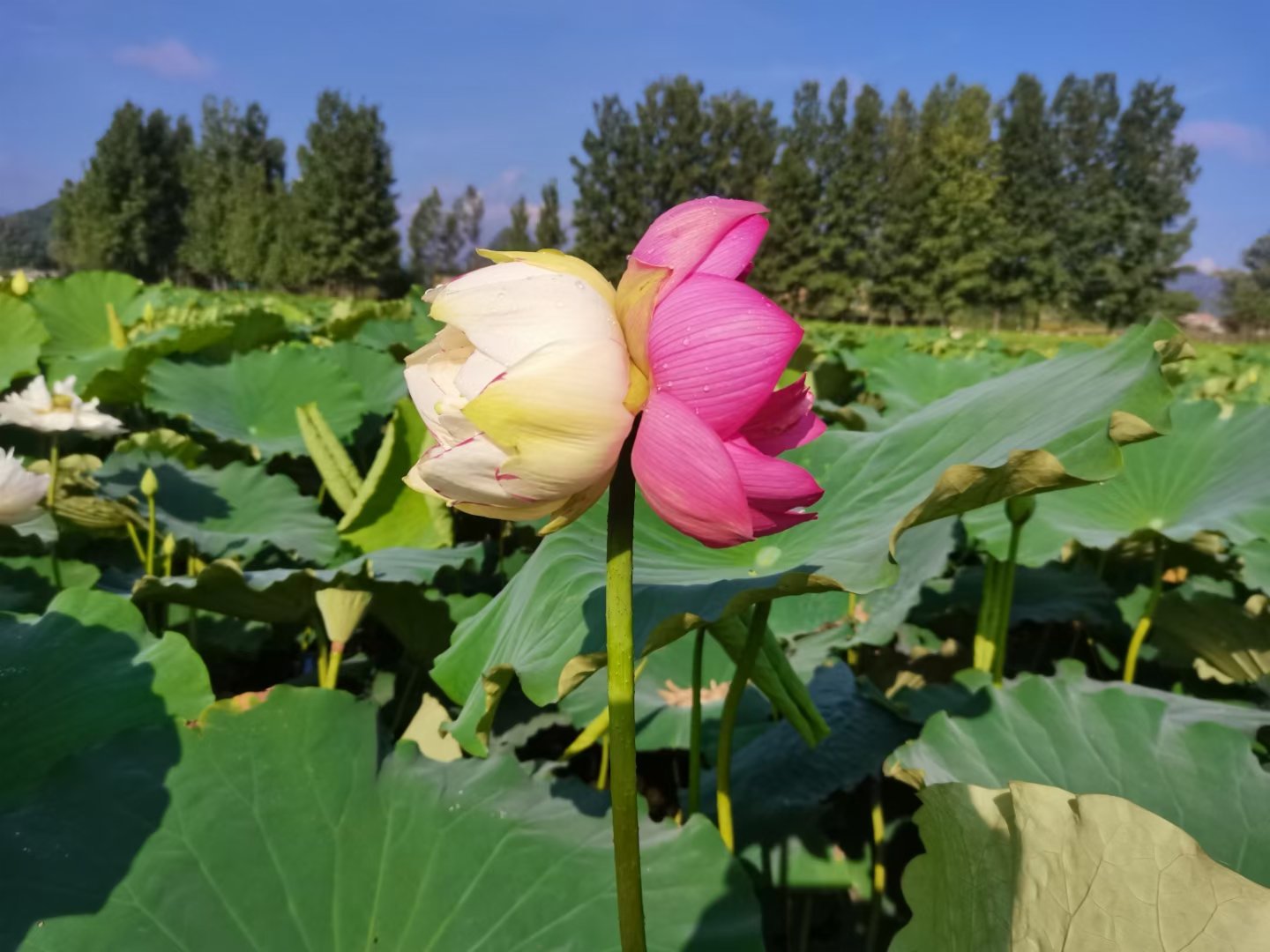現身普者黑的這株並蒂蓮,一邊是大灑錦、一邊是小灑錦,顧盼生姿合二為一,在河道旁亭亭玉立,成為一道瑰麗的景致,引人入勝。普者黑現並蒂蓮的消息在社交媒體傳開後,許多遊客紛紛慕名而往觀賞。正在普者黑遊覽的張先生甚至循社交媒體線索而去,最終找到該株並蒂蓮打卡拍照,大呼 「好運蓮蓮」!