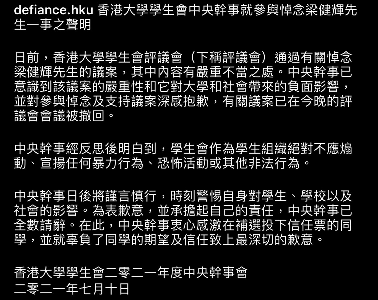 聲明指,港大學生會評議會通過有關「悼念」兇徒的議案,內容有嚴重不當之處,中央幹事已意識到議案的嚴重性和對大學和社會帶來的負面影響,並對參與悼念及支持議案深感抱歉。
