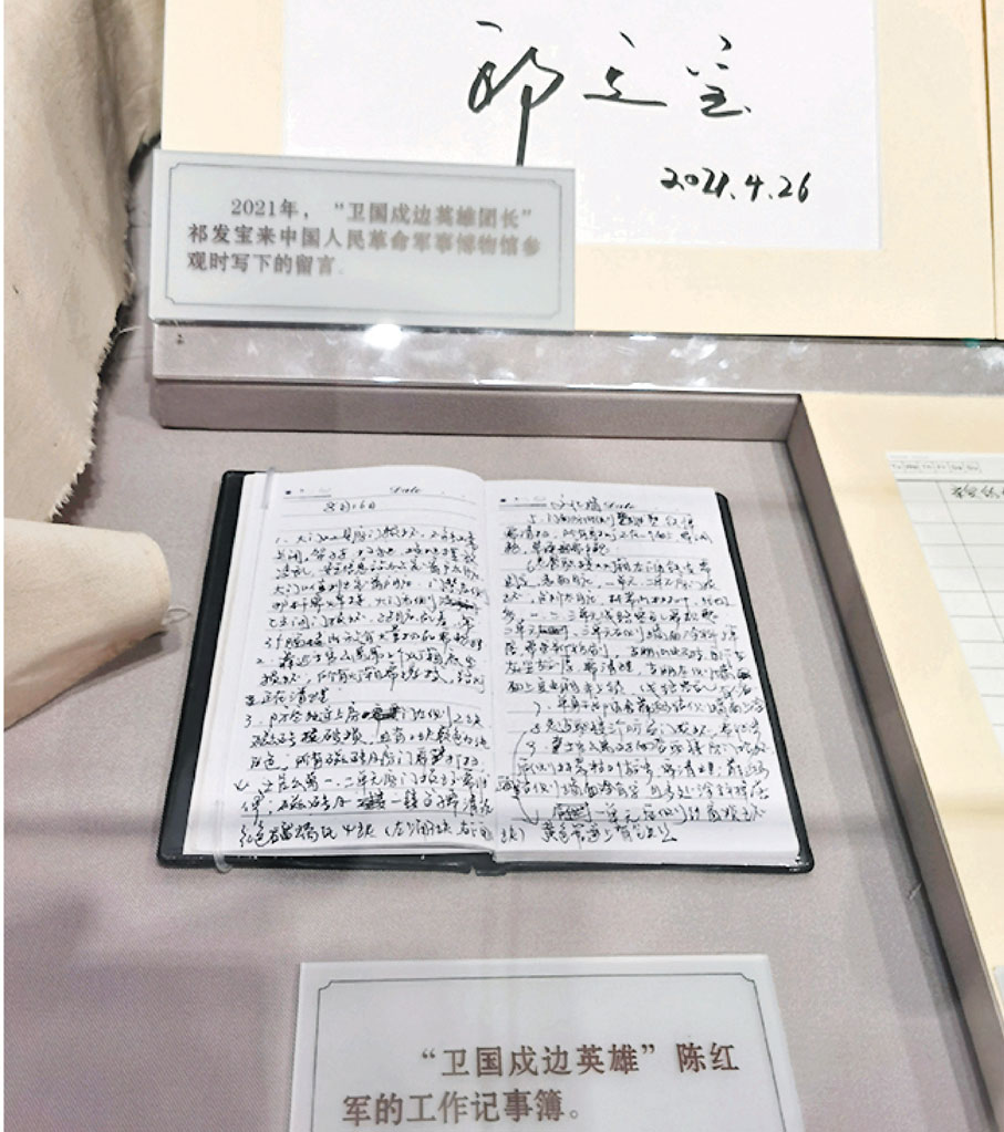 香港文匯報訊(記者 葛沖 北京報道)「衛國戍邊英雄團長」祁發寶的手書、「衛國戍邊英雄」陳紅軍的工作記事簿、一等功獲得者陳祥榕寫給媽媽的信、一等功獲得者肖思遠犧牲時被撕破的棉衣、一等功獲得者王焯冉的請戰書和入黨申請書……近日,衛國戍邊英雄實物遺物在軍事博物館正式對外展出。現場,「大好河山 寸土不讓」八個大字和一件件英雄實物遺物,令現場參觀者們為之動容,一次次將人們的記憶帶回到去年6月的加勒萬河谷。