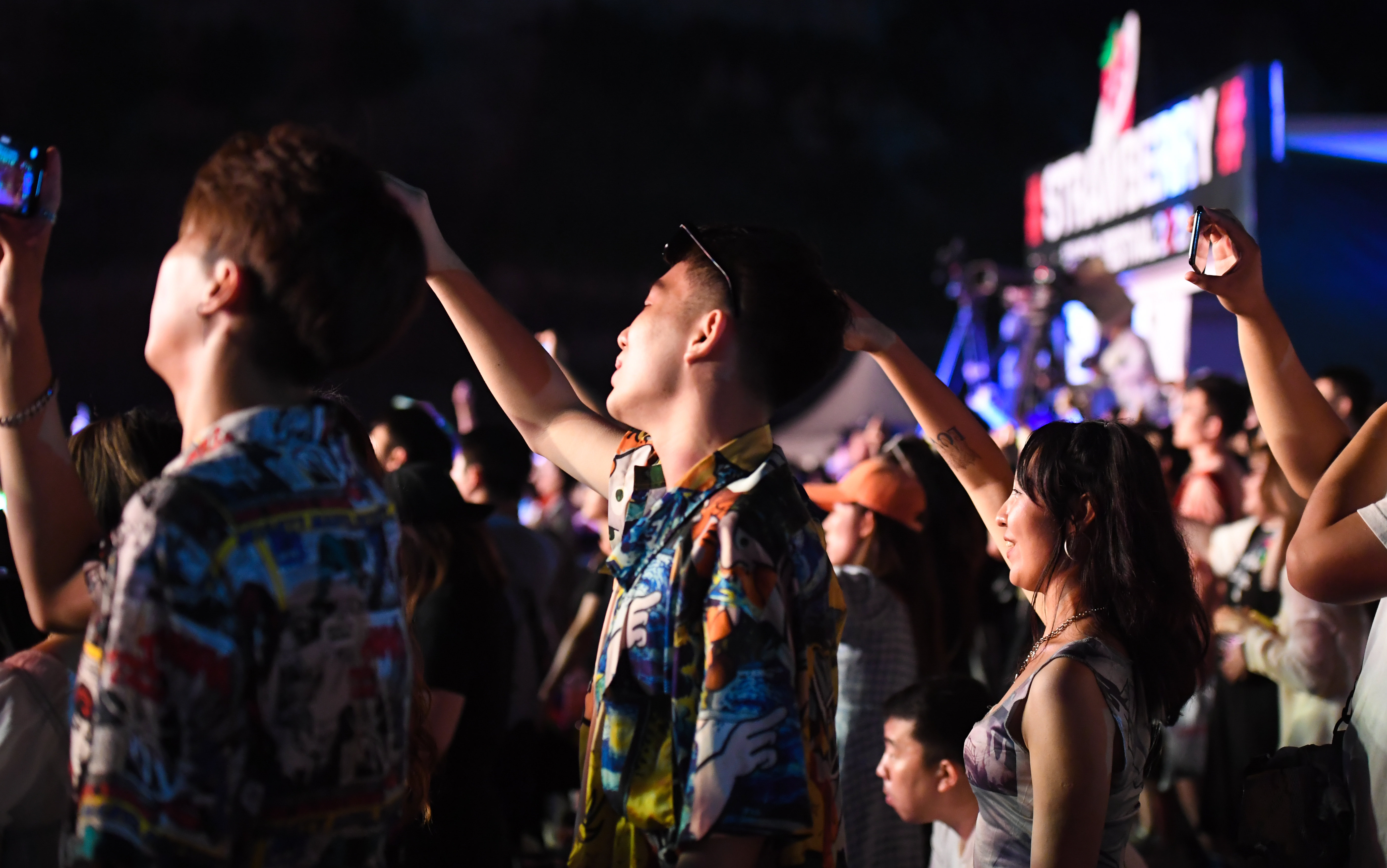 觀眾在阜新草莓音樂節現場隨着音樂跳舞。(新华社)
