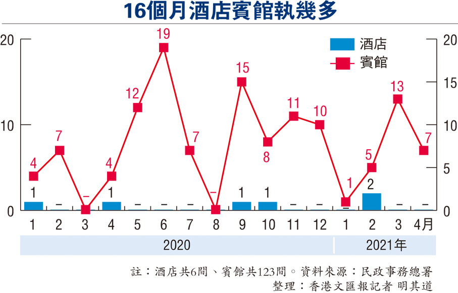 根據民政事務總署轄下的牌照事務處記錄,由去年1月至今年4月,共有6間酒店及123間賓館由於持牌人在牌照到期前未提出續牌申請、撤回續牌申請,或要求取消牌照而導致牌照失效(見圖)。