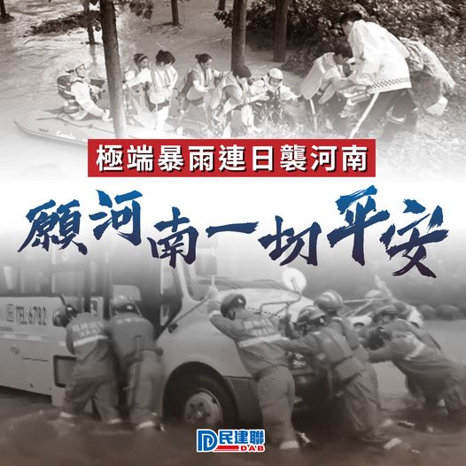 香港民建聯表示,祝願河南同胞一切平安,也為所有救援人員打氣!加油,河南撐住!