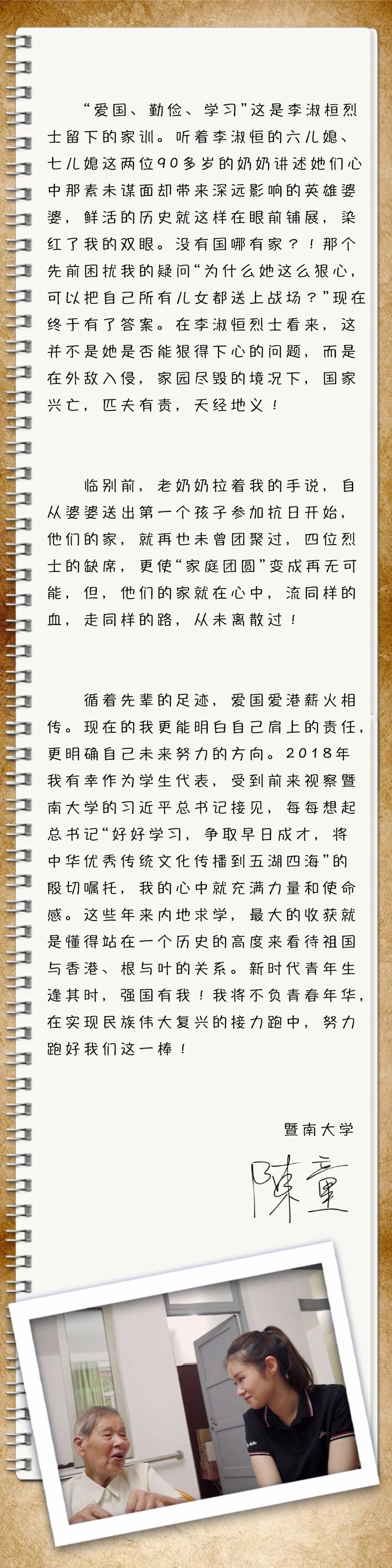 我叫陳童,來自香港,是暨南大學的一名研究生。我在學校圖書館偶然間看到一位香港女教師的名字——李淑桓,「東江游擊隊之母」「英雄母親送七個兒女上抗日戰場」「全家四位烈士」……讓我對她產生了太多的好奇:作為一位母親,一次次與兒女的生離死別,究竟經歷了怎樣的內心煎熬?是什麼力量驅使她為國家獻出自己的所有?