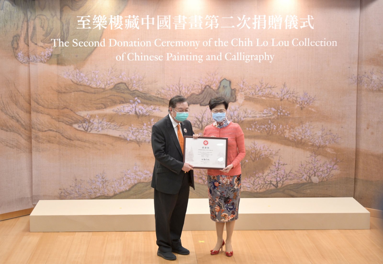 行政長官林鄭月娥今日出席至樂樓藏中國書畫第二次捐贈儀式致辭時表示,今次捐贈不但延續何老先生弘揚國粹的高尚情操,體現私人收藏家與特區政府的同心同德,更彰顯何氏家族對特區政府的信任。深信今天捐贈的8件書畫,與3年前的珍品一樣,不但能豐富藝術館的館藏,更有助提升香港作為國際文化之都的地位。