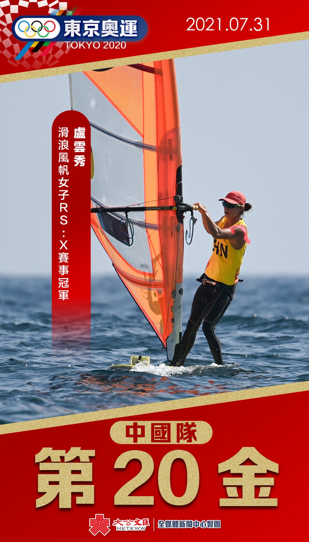 北京時間7月31日,在東京奧運會女子帆板RS:X級獎牌賽中,中國選手盧雲秀發揮出色,獲得該項目金牌。這也是中國代表團在本屆奧運會上的第20枚金牌。