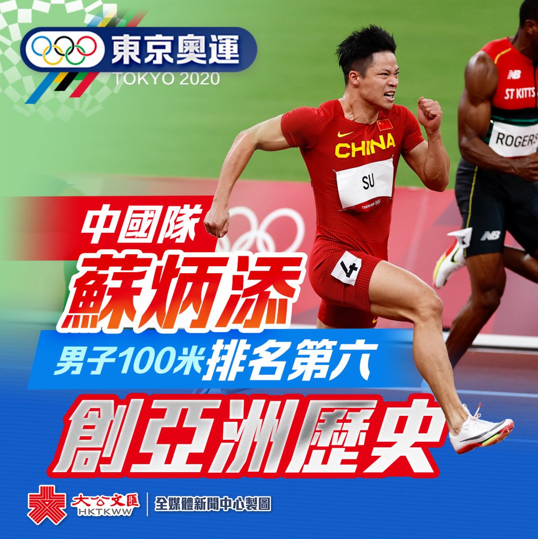 8月1日晚,東京奧運會田徑男子100米決賽中,中國選手蘇炳添跑出9秒98,獲得第六名。在此前的半決賽中,蘇炳添跑出9秒83,成為首位闖入奧運會男子百米決賽的中國運動員。