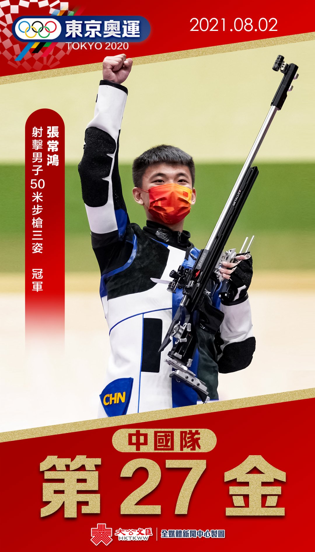 2021年8月2日,中國00後小將張常鴻獲得東京奧運會男子50米步槍三姿金牌,並創造了新的決賽世界紀錄。這是中國代表團在此次奧運會中獲得的第27枚金牌。