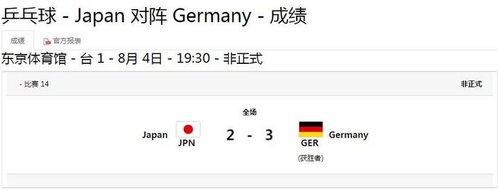 今日(4日)晚,東京奧運會乒乓球男團半決賽中,東道主日本隊2:3不敵德國隊,無緣決賽。比賽中張本智和為日本隊拿到兩分,但日本隊在另外兩場單打比賽和一場雙打比賽中全部敗北。德國隊將和中國隊爭奪最後的冠軍。