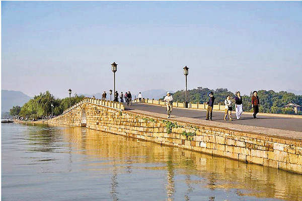 無獨有偶,大文豪蘇軾也在西湖修有攔洪長堤--即「蘇堤」,世代受人讚揚。北宋元祐五年(1090年),蘇軾出任杭州知州,他深諳民生疾苦,積極疏浚西湖,用浚挖的淤泥修築一道堤壩,並在堤岸建起映波、鎖瀾、望山、壓堤、東浦、跨虹六條著名虹橋,他還詩云「我來錢塘拓湖綠,大堤士女爭昌豐。六橋橫絕天漢上,北山始與南屏通」,杭城人為紀念蘇軾治理西湖之豐功,將它命名「蘇堤」。自宋以來,「蘇堤春曉」就是「杭州十景」之一。