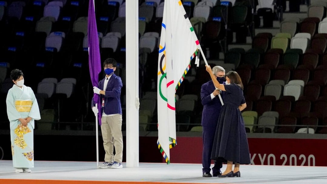 經過運動員進場及表演後,進行了奧林匹克會旗交接儀式。在會旗降下後,東京都知事小池百合子將會旗交給國際奧委會主席巴赫,再轉交巴黎市長伊達爾戈。
