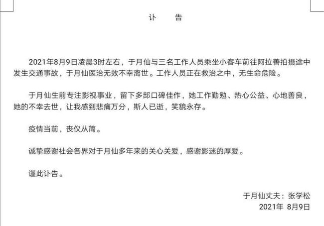 8月9日,憑藉《鄉村愛情》中謝大腳一角而深受觀眾喜愛的演員于月仙因車禍去世,年僅50歲。當晚,她的丈夫張學松發布訃告:「斯人已逝,笑貌永存。疫情當前,喪儀從簡。」