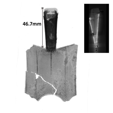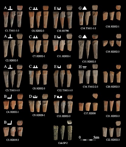 2017-2018年,鄭州大學考古隊在官莊鑄銅作坊的田野發掘過程中,辨識出了4類與布幣鑄造相關的遺存,包括空首布成品、尚未使用的芯範、已使用的芯範以及外範。其中最能夠直接表明官莊鑄銅作坊生產制式化金屬貨幣的遺存是空首布的芯範。共在9個堆積單位中發現了54枚芯範,可分為尚未使用和使用後廢棄的兩種。銎芯範質地均為紅褐色粉沙。形態基本一致,呈扁錐狀,剖面接近正六邊形。根據對空首布成品的CT影像觀察,這些芯範與遺址中所出土的2枚空首布成品銎內所嵌留的芯範完全一致,橫截面亦呈六邊形,由此確定這些成品布幣就是在官莊遺址生產的。