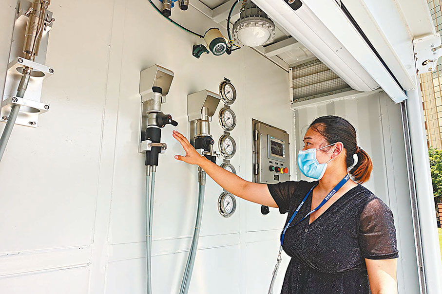 在該公司總部廣州圓大廈的生態之舟園區,記者看到了這款移動加氫站。移動加氫站的側面車廂安有兩把黑色的加氫槍,能直接給停靠的新能源大巴加氫,全程十分安靜。加氫站的管子旁邊還有兩個儲氣壓力錶。只要將這節貨櫃箱大小的移動加氫站移動到貨車上,便能迅速「上路」,既可以停在傳統的加油站旁邊,補充加氫,也能獨立停放在不同地區。目前,加氫站主要能為公交車、輕型客車、物流車等多種燃料電池汽車加氫,日加注量為500KG。