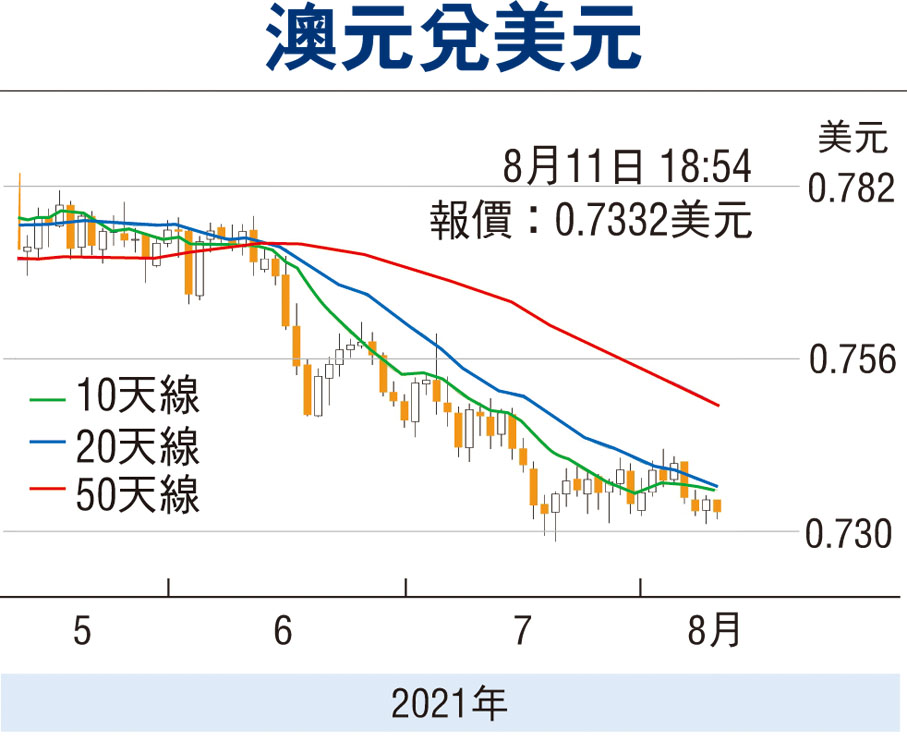另一方面,澳洲統計局上周四公布每周工作職位與工資變化數據顯示,自7月3日至7月17日兩周之間,就業職位下跌2.4%,較6月19日至7月3日的1%跌幅進一步擴大,不排除澳洲統計局下周四公布的7月份就業數據將遜於6月份表現。此外,市場憂慮美國聯儲局可能提早收緊政策之際,美國政府卻繼續推出大規模的刺激經濟計劃,加上美國本周三公布7月份消費者物價指數年率為5.4%,與6月份相若,顯示通脹升幅稍為放緩,美元指數未能持穩93水平,有助抑制澳元跌幅。預料澳元將略為反彈至74.50美仙水平。