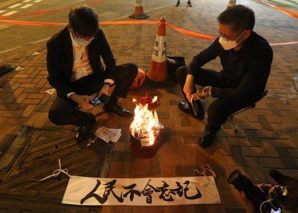 2020年5月22日,第十三屆全國人民代表大會把訂立香港國安法放上議程。林洋鋐和陳清華拖着一幅寫有反中亂港口號的橫額,走到中聯辦門外示威、叫口號。