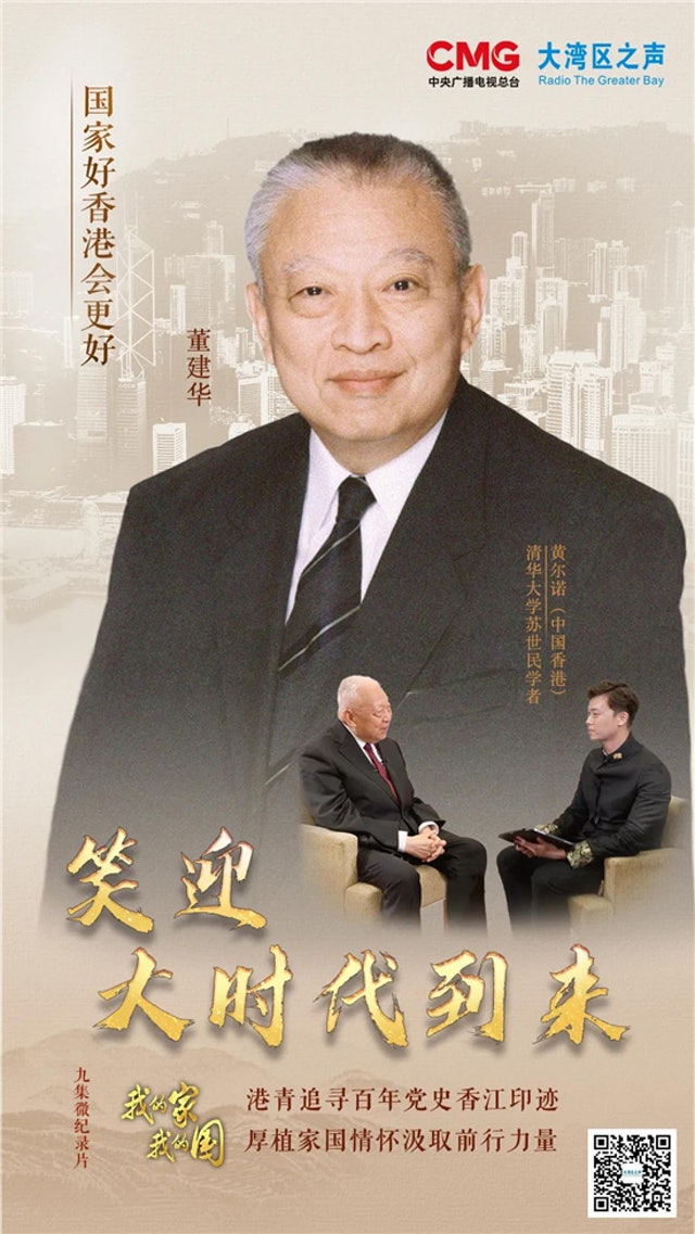 大公文匯全媒體報道:央視旗下的「大灣區之聲」,近日推出9集「微紀錄片」《我的家我的國》,並稱這是「香港年輕學子追尋先輩愛國愛港的歷史足跡,汲取繼續前進的智慧和力量」。在「笑迎大時代到來」這一集中,來自香港的清華大學蘇世民書院碩士生黃爾諾,就在世界範圍內都史無前例的新制度「一國兩制」,如何在香港平穩運行逾二十年,訪問了全國政協副主席、香港首任行政長官董建華。
