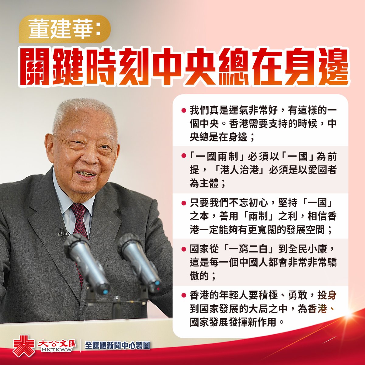 董建華說,有機會參與這個大時代是一種福氣,見證了國家從「一窮二白」到全民小康的整個過程,「這個是中國是每一個中國人都會非常非常驕傲的。」董建華還呼籲,香港的年輕人要積極、勇敢,投身到國家發展的大局之中,為香港、國家發展發揮新作用。