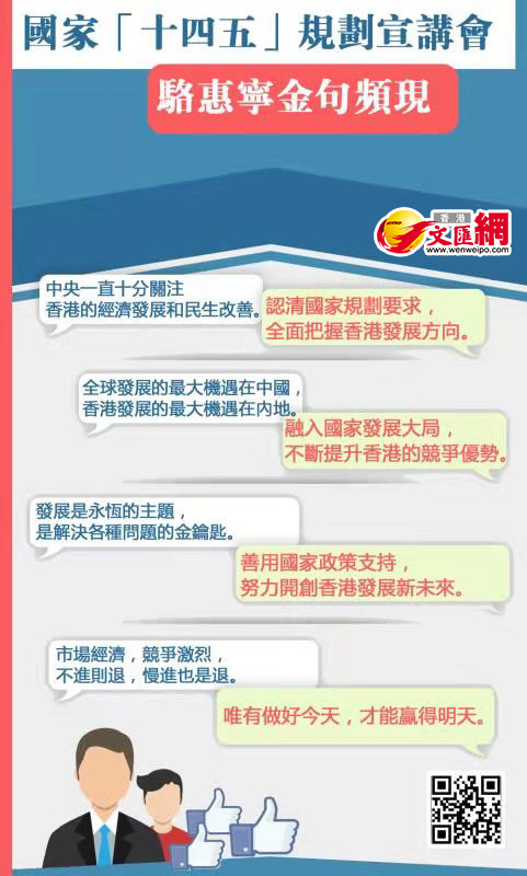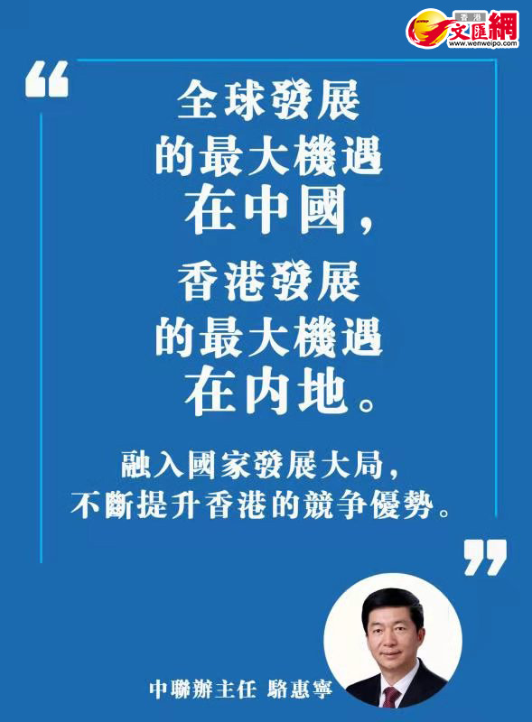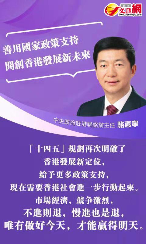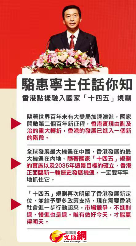 國家「十四五」規劃宣講團本周來港,通過多場會議向各界介紹「十四五」規劃綱要。首場宣講會今日(23日)上午在政府總部舉行,香港中聯辦主任駱惠寧出席並發表致辭,對香港如何融入國家「十四五」規劃提出三點看法。他表示,國家「十四五」規劃對香港的發展提出了一系列重大要求,體現了中央統攬國際國內兩個大局,推動香港實現長期繁榮穩定的戰略考慮。駱惠寧指出,全球發展的最大機遇在中國,香港發展的最大機遇在內地。隨着國家「十四五」規劃的實施以及2035年遠景目標的確立,香港正面臨新一輪歷史發展機遇,一定要牢牢地抓住它。