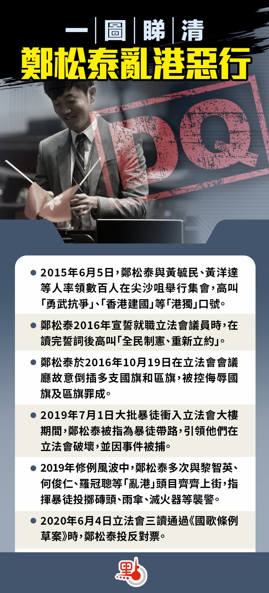 大公文匯全媒體報道:身兼資審會主席的政務司司長李家超今日(26日)見傳媒時公布,資審會裁定鄭松泰的參選資格無效。鄭松泰被裁定不符合擁護基本法和效忠特區的要求和條件,喪失五年參選資格,意味着鄭松泰不僅即時喪失立法會議員資格,亦不能參加下屆立法會選舉。翻查資料,「熱血公民」鄭松泰亂港罪行纍纍。各界人士表示,鄭松泰被DQ完全是咎由自取。
