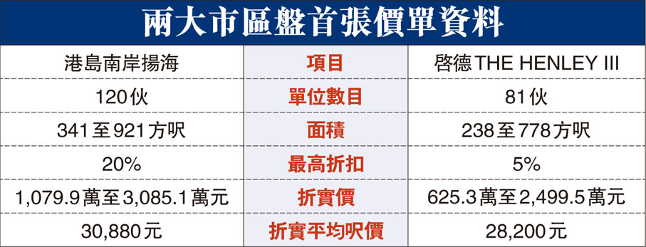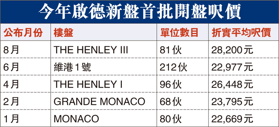 市區新盤爆搶客戰。嘉里夥信置及港鐵合作、樓花期約2年的黃竹坑站港島南岸揚海本周二以逾千萬元首推120伙之際,恒基地產旗下樓花期約8個月的啟德THE HENLEY III昨亦公布首張價單共81伙,扣除最高5%折扣,折實平均呎價28,200元,不但比4月同系THE HENLEY I首張價單折實平均呎價26,448元貴6.6%,更是貴絕啟德區新盤首度開售呎價,238方呎開放式折實625.3萬元入場。發展商更為700方呎或以下單位買家提供九成一按或四成二按,惟折扣只有3%。●香港文匯報記者 梁悅琴