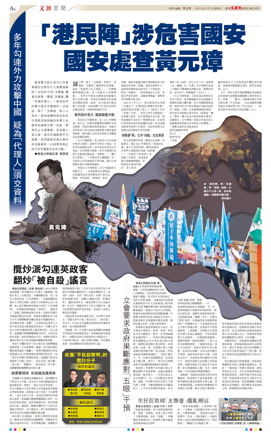 香港警方前日首次引用香港國安法第四十三條實施細則,去信約10名「支聯會」董事及幹事,懷疑「支聯會」屬「外國代理人」,要求他們向警方提交有關資料。消息指,除了「支聯會」核心人物外,與該會關係密切的反中港亂成員組織的負責人也被列為調查目標,包括「香港民主中國陣線」及負責人黃元璋,疑收外國錢替外力服務,故同被要求提交資金及活動資料,以偵查及制止任何危害國家安全的活動。 ●香港文匯報記者 蕭景源