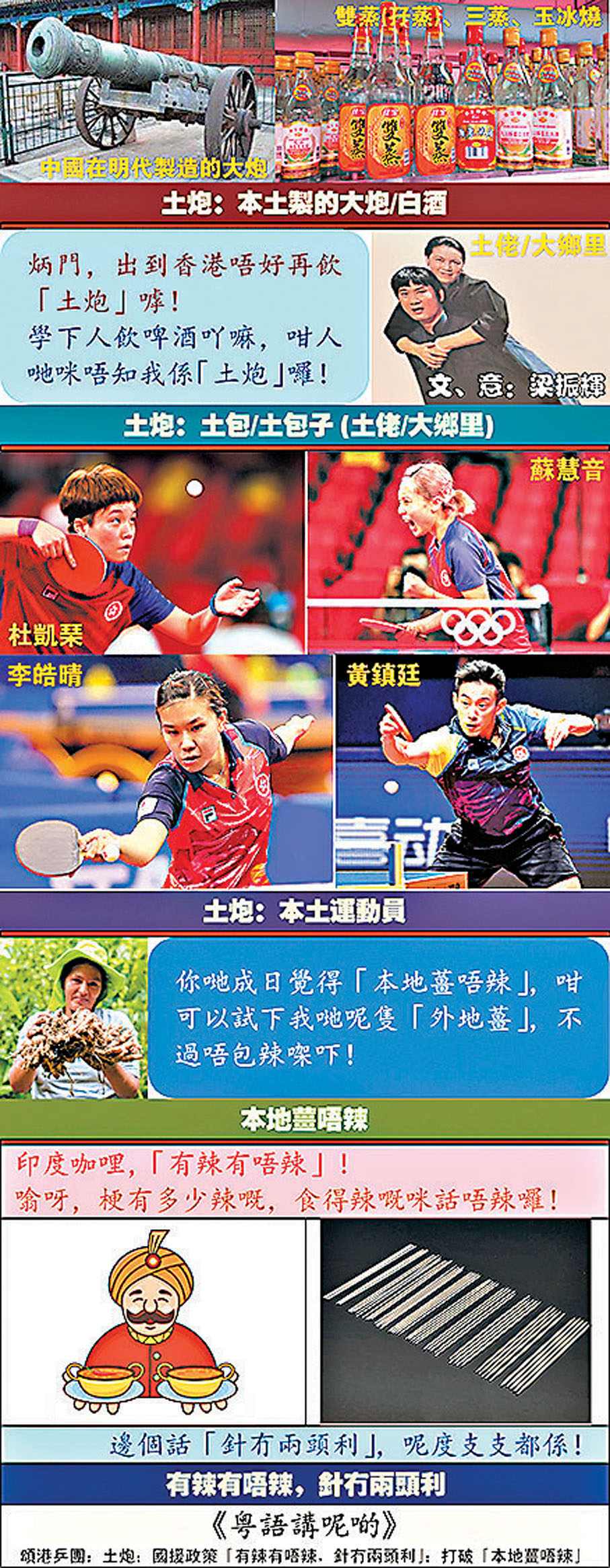 查以上各人均為內地來港的運動員,他們絕非泛泛之輩,只是內地乒壇人才輩出,於是選擇來港發展,當年的港英政府自是無任歡迎。這批運動員多被稱為「海外乒團」或更準確的「國援」——從中國內地引入的外援。「國援輸入」無疑可將水平即時提升,但與此同時亦窒礙了「土炮」的發展空間——「國援」愈是取得好成績,「土炮」就愈少出場機會。試問連出場機會都很少或沒有,「土炮」又何來提升水平呢?把當時形勢說成「有辣有唔辣/針冇兩頭利」着實貼切不過。話雖如此,「土炮」卻變相有了不少向世界頂級球員「偷師」的機會,這對提升水平有莫大裨益;加上不少「國援」在退役後留港參與培訓「土炮」的計劃,直接將寶貴經驗傳承予「土炮」;待「土炮」打出一定水平時,體院便沿用「以舊帶新」方式有秩序地把「土炮」推上賽場。黃鎮廷、杜凱琹、李皓晴、蘇慧音等「土炮」正是「國援政策」下的產品。