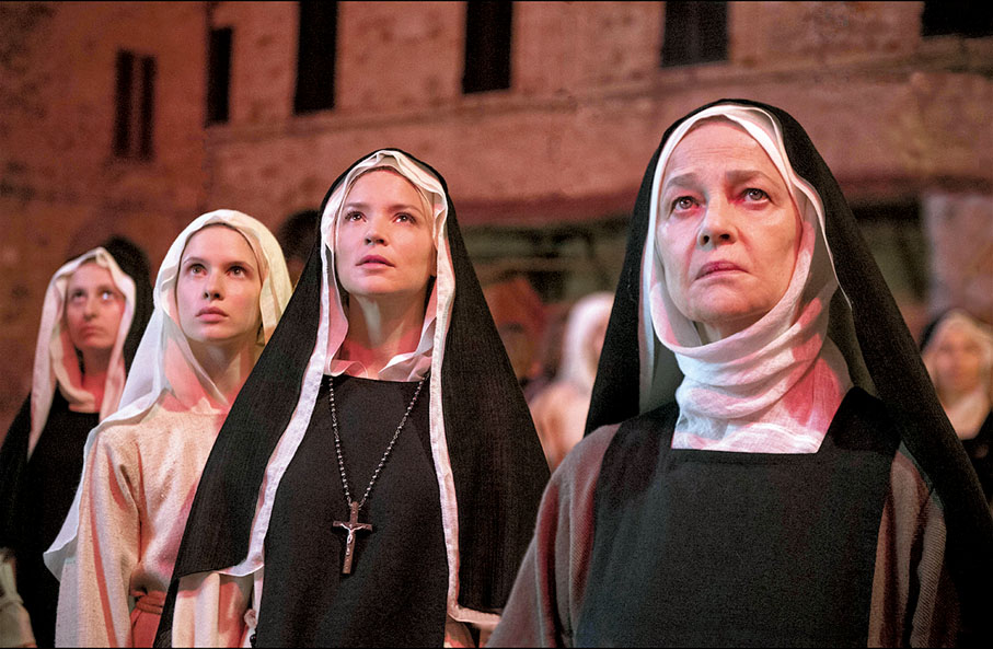 改編自17世紀意大利修女真實事跡的電影《聖慾》(Benedetta,見圖),談論到修女被禁止的規條,例如:不能和姐妹們同睡、不能和姐妹們手拖手、不能在姐妹面前展露自己身體、不能做出誘惑姐妹的舉動等等,在這一連串的拑制下,主角貝妮迪塔就在年輕野性的見習修女挑逗之下,被禁壓的情慾和權力慾望就一觸即發,徹底裸露到被教廷人員遠道而來調查審判,再引發一場權力鬥爭。