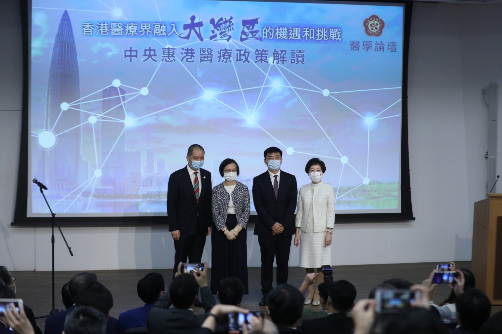 由香港中華醫學會主辦,14間醫學相關組織聯合舉辦的「香港醫療界融入大灣區的機遇和挑戰論壇──中央惠港醫療政策解讀」昨日(4日)下午於香港醫學專科學院,論壇邀請國家衞生健康委專家、廣東省藥監局專家、廣東省衞生健康委專家介紹《香港、澳門特別行政區醫師在內地短期行醫管理規定》、《香港和澳門特別行政區醫師獲得內地醫師資格認定管理辦法》、《人社部、國家衞生健康委、國家中醫藥局關於深化衞生專業技術人員職稱制度改革的指導意見》及《港澳藥械通政策》等大灣區醫療惠港政策解讀,並邀請不同界別人士分享醫療界融入大灣區發展的經驗。