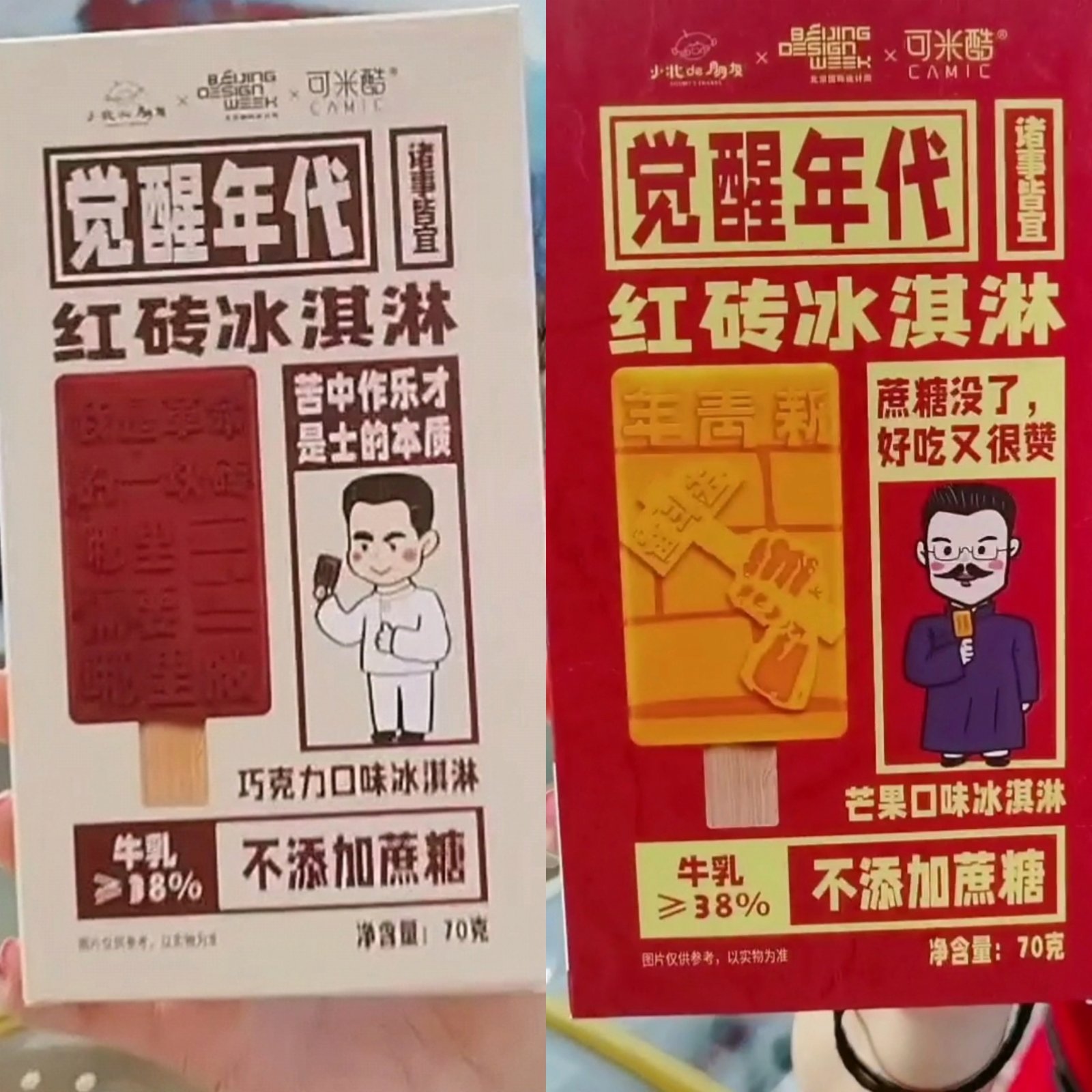 記者看到,服貿會《覺醒年代》的展位上,擺滿了各種口味的巧克力、黃油曲奇等。當然,在文創產品雪糕「內卷」(網絡用語,指「被自願」競爭)嚴重的當下,《覺醒年代》自然不能放棄這個領域。目前《覺醒年代》開發了兩款紅磚冰激凌,一個是純手磨巧克力口味、一個是芒果口味。同時,為了迎合當下年輕人對「低糖低脂」的要求,兩款冰激凌均未添加蔗糖。記者發現,短短五分鐘內已有十餘人爭相來問「冰激凌多少錢」,而該款紅磚冰激凌早在半日間就被搶空,僅剩下用於展示的盒子。