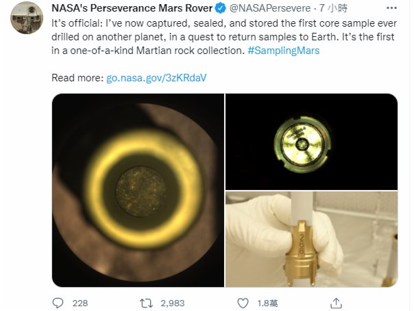 NASA官方Twitter 5日發文稱,「我(「毅力」號)採到了!」,並展示了樣品管內的岩芯樣本。隨後,該賬號表示,「我已經採集、密封並儲存了第一個在另一個星球上鑽取的岩芯樣本,期望能讓樣本被帶回地球。這是獨一無二的火星岩石採集中的第一塊」。