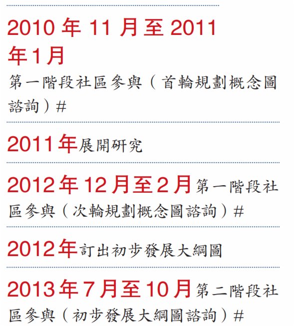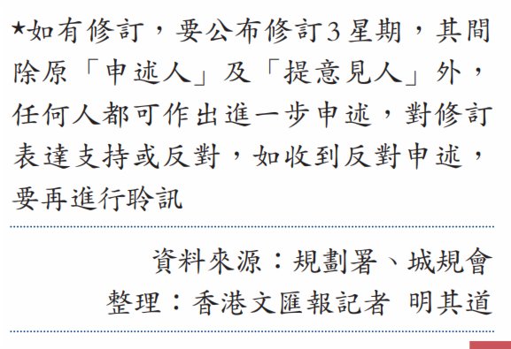 而第三階段社區參與,即對建議發展大綱圖的諮詢亦可免去:「建議發展大綱圖同城規會公布嘅分區計劃大綱圖相似,無必要諮詢完一次又一次。」若按劉國勳的建議,單單是諮詢時間已可減省9個月,加上其中的行政時間,隨時減省兩三年時間。
