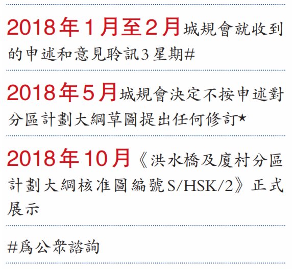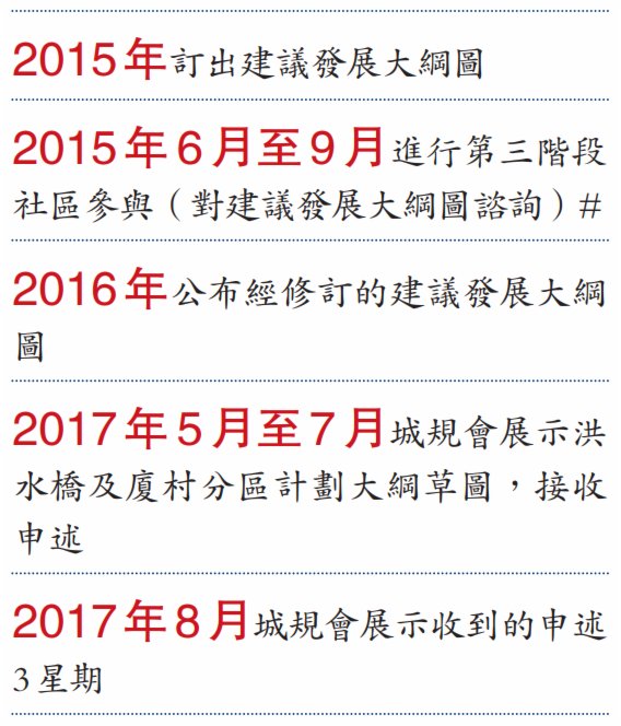 翻查規劃署及城規會資料,洪水橋/廈村新發區由首次提出到走完整個規劃程序耗時近30年,最後8年程序一直在諮詢、規劃、再諮詢、再規劃的過程中打滾。民建聯立法會議員劉國勳日前接受香港文匯報訪問時直言,該項目花8年進行五輪公眾諮詢,顯然是過多,他認為第一階段社區參與,即首輪、次輪規劃概念圖諮詢就可以省卻:「規劃概念圖太抽象,你睇吓洪水橋規劃,佢2010年11月舉行首輪諮詢,那時連研究都未做(翌年才展開研究),這一兩年諮詢係浪費時間。」