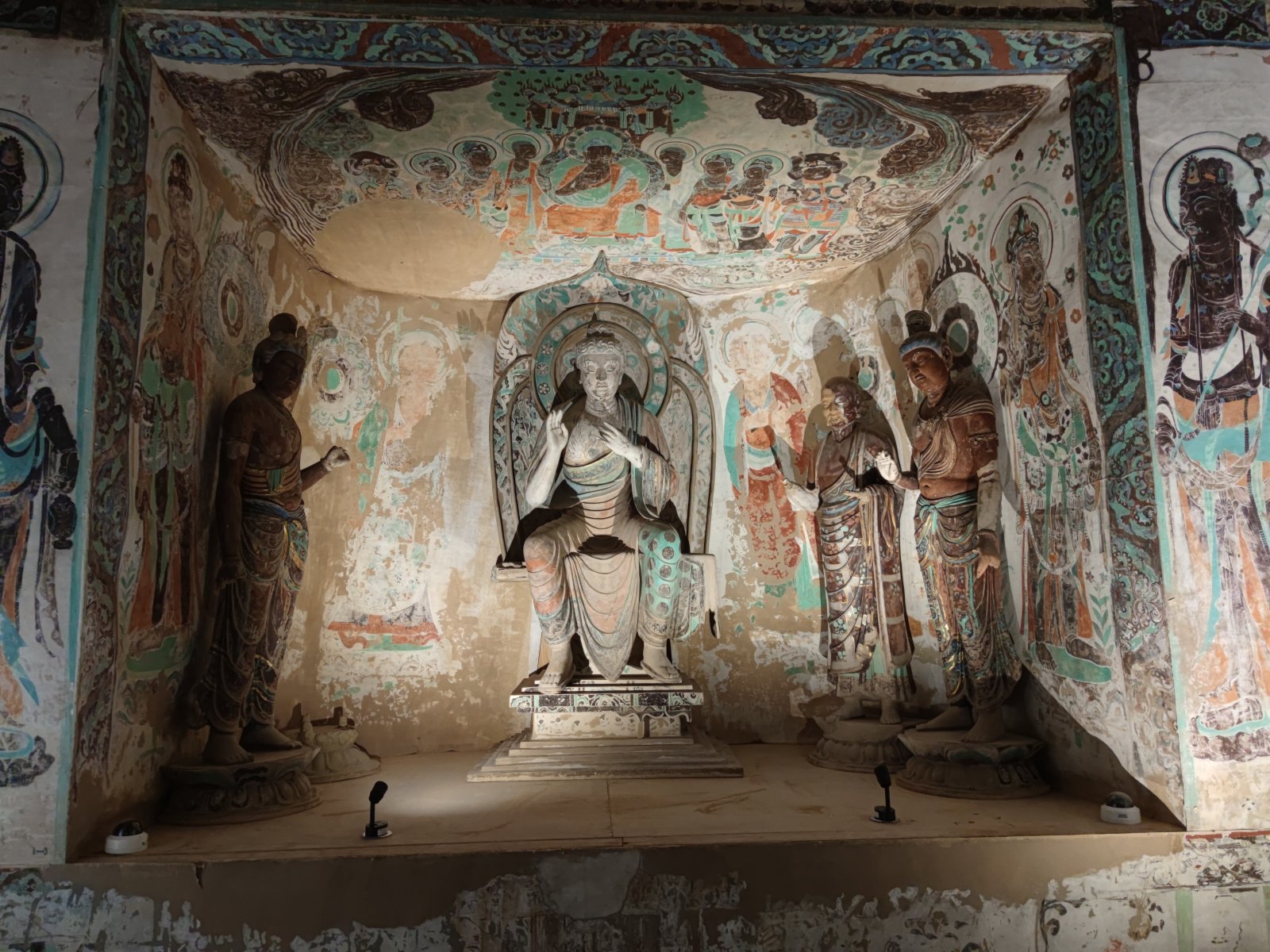 第320窟是盛唐的代表窟之一。窟頂鑿井繪雲頭牡丹井心,顏色濃艷厚重,宛若剛完工不久。窟內有大片缺失,顯得刺眼。這部分壁畫在1942年,被美國人華爾納盜竊。第285窟則是敦煌石窟中最早有確切開鑿年代的洞窟。壁畫中,雷神、伏羲、女媧等中國傳統神話中的人物露臉。