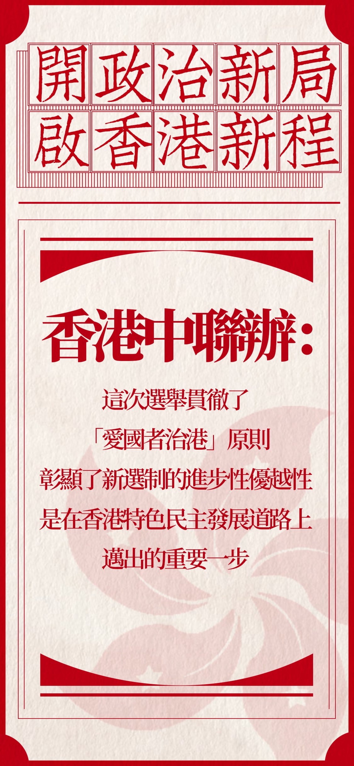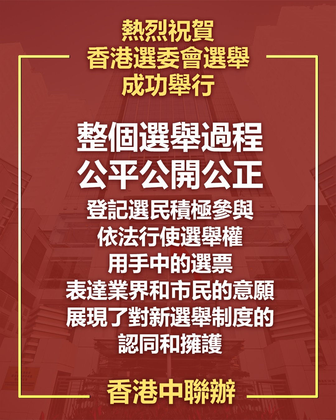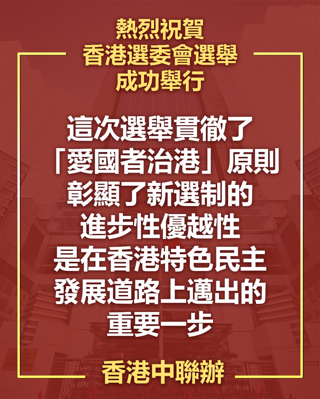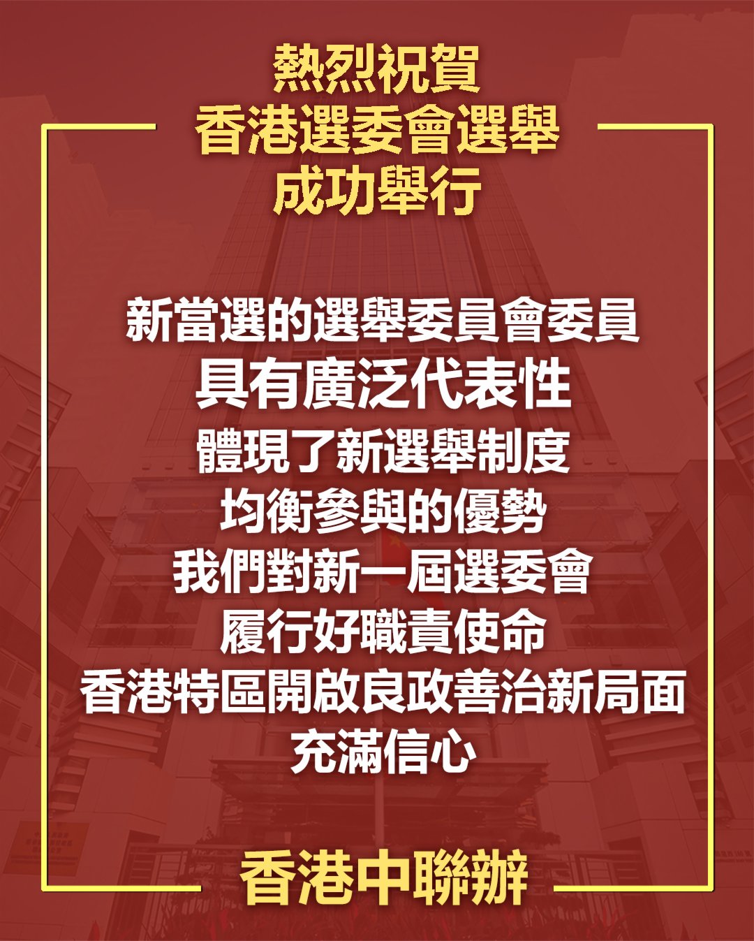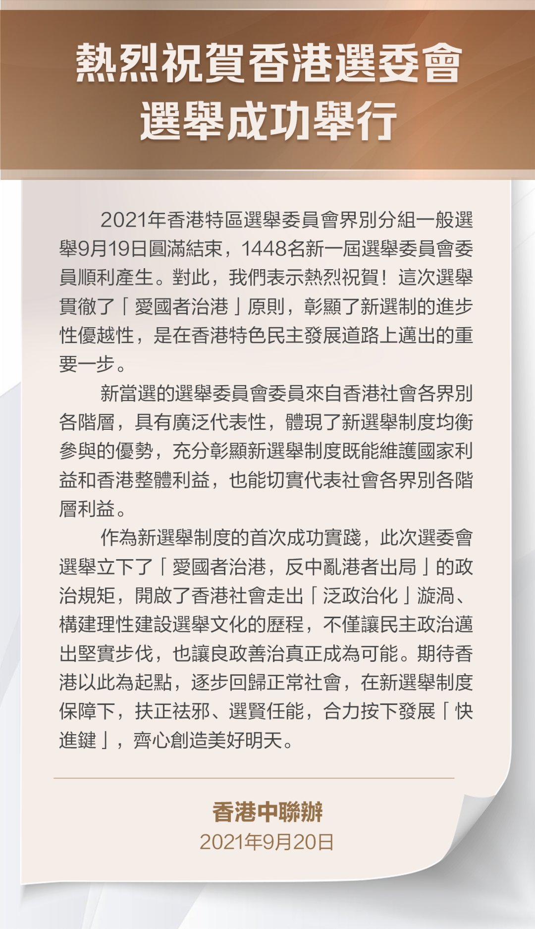 香港中聯辦今日(20日)發表聲明表示,香港特區2021年選舉委員會界別分組一般選舉昨日(19日)圓滿結束,1448名新一屆選舉委員會委員順利產生。聲明強調,這次選舉貫徹了「愛國者治港」原則,彰顯了新選制的進步性優越性,是在香港特色民主發展道路上邁出的重要一步。