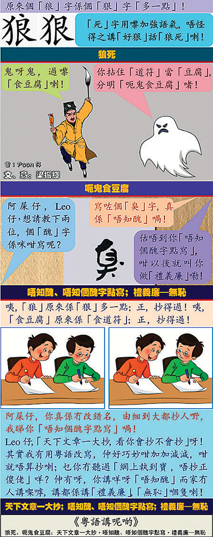 筆者曾於本欄發布了「狼死」中的「狼」源自「狠」(狼即狠「多一點」)和「呃鬼食豆腐」源自「呃鬼食道符」這兩個「獨家發現」,其後名為「史檔/區區有故講」的社交網站寫手「阿史」把上述觀點「視為己出」,還博得Google將其中一文列為「精選」;其一貫「抄」的手法正是上述的(3)、(4)。筆者在發現此等侵權劣行後即時向相關單位(Google、圈傳媒)舉報,至今未獲回應。實話實說,筆者對屢被侵權的强烈反應非出於「心有不甘」,而是「心有不明」——為何受人敬仰的「寫作人」可以「唔知個醜字點寫」?筆者一好友打趣地說:此人「真識貨」——不好也沒有人會抄,筆者則回應道: