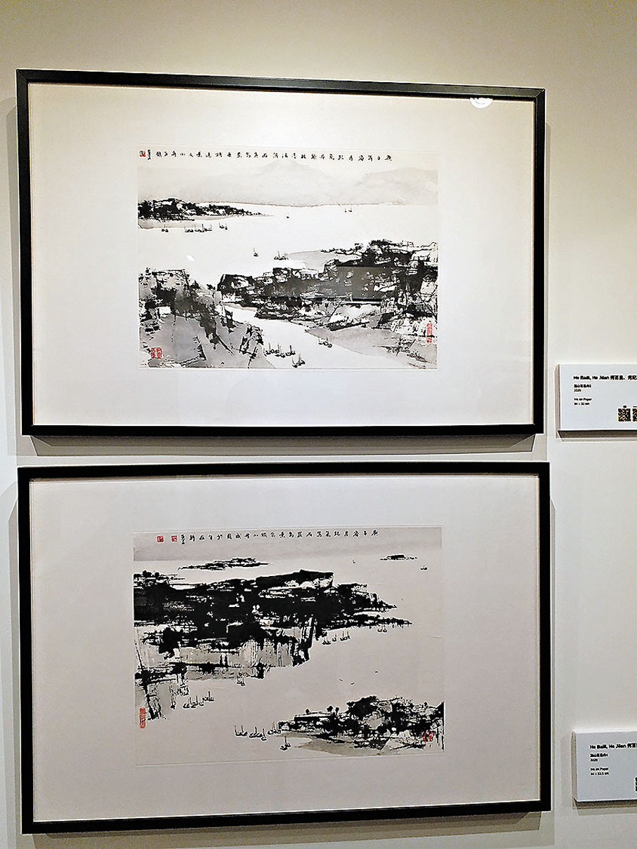 何百里在是次展覽展出多幅山水及花卉作品。何百里喜愛到處遊歷寫生,其筆下的山水,集西方繪畫的光影效果及各家各派的技法於一身,成就了獨樹一幟的「何家山水」。而其花卉作品受西洋繪畫藝術的色彩影響,用墨淡雅,筆觸溫潤,牡丹生機盎然,玫瑰清逸恬靜。是次展覽的亮點之一,是由何氏父子共同創作的小品《嵐山百里舟》系列,名稱來自兩人的名字,代表了兩代畫家新舊交融。何紀嵐介紹道,在創作過程中,他先繪畫出自然風景,再由父親加上其標誌性的屐形輕舟,形成極具意趣的小品。