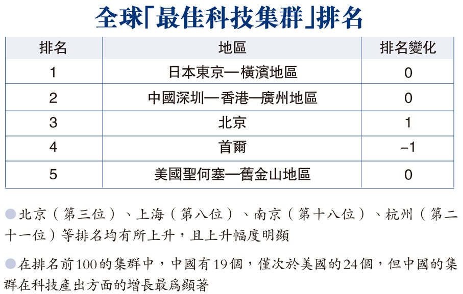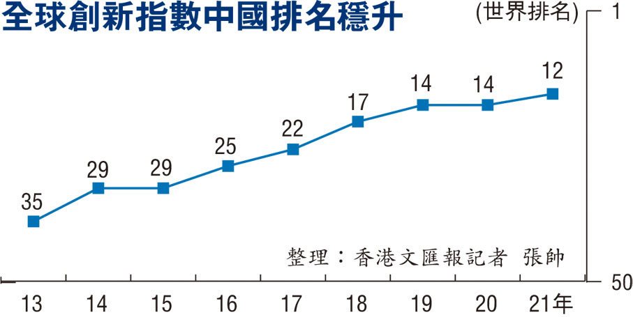 香港文匯報訊(記者 張帥 北京報道)9月20日,世界知識產權組織(WIPO)發布《2021年全球創新指數報告》(下稱《報告》),中國排名第十二位,位居中等收入經濟體首位,較2020年上升兩位,已連續9年穩步上升。在報告有關全球「最佳科技集群」排名中,「中國深圳-香港-廣州地區」位列全球第二位,北京排名第三位。世界知識產權組織稱,中國已確立全球創新領先者地位。
