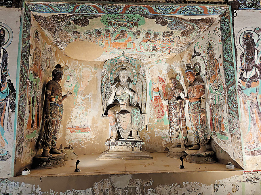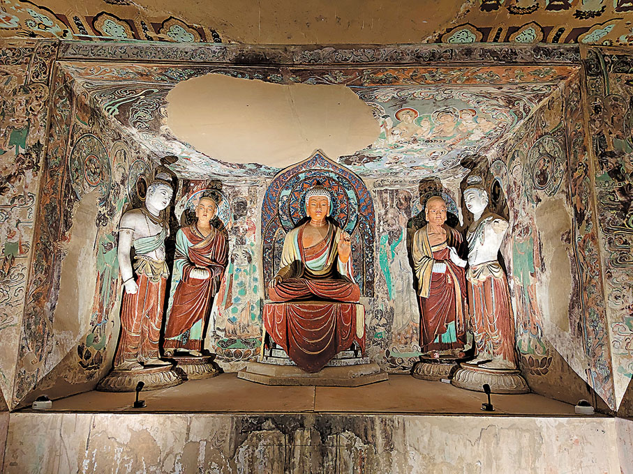 另外,值得一提的是,在午門西馬道下臨時展廳還同時展出敦煌莫高窟第285窟、第220窟和第320窟三個複製洞窟,按時代順序分別是西魏、初唐和盛唐。其中,285窟是敦煌石窟中最早有確切開鑿年代的洞窟,220窟藥師經變中的兩幅「對舞」及其樂隊是研究樂舞的寶貴資料。320窟則是盛唐的代表窟之一,窟頂藻井色彩濃艷厚重,保存猶新,北壁畫的觀無量壽經變圖境界優雅,色調清淡,為盛唐同類經變題材之一風格。