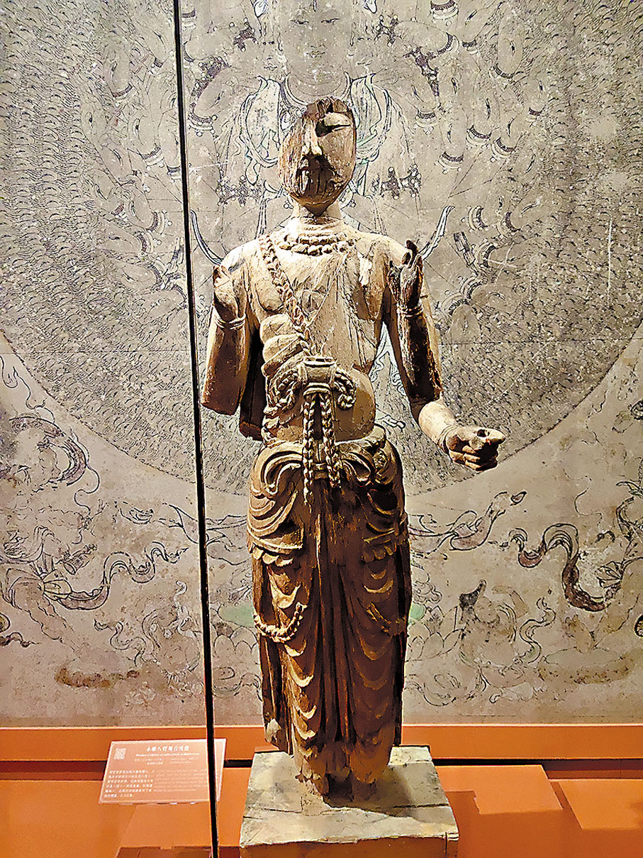 現場還展出了一件北宋八臂觀音木雕。觀音菩薩像由楊木整體雕出,從殘存手臂情況分析應是八臂十一面觀音菩薩像。在敦煌壁畫中有許多八臂十一面觀音像,但雕塑像稀少,這尊歷經劫難倖存下來的木雕像,尤為珍貴。