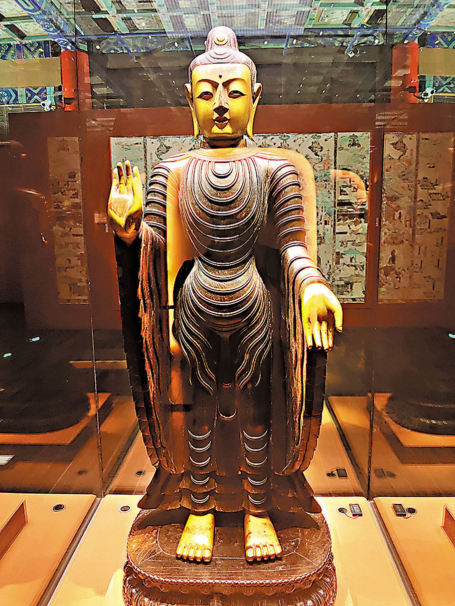 另有一件旃檀佛吸引了不少觀眾駐足。旃檀佛原作最初供奉於印度, 4世紀由鳩摩羅什攜帶至涼州,幾經輾轉終至北京聖安寺供奉。1665年(清康熙四年),旃檀佛移入弘仁寺供奉。1900年八國聯軍入侵,旃檀佛原作或隨弘仁寺一同毀於戰火,至今下落不明。此像為乾隆朝弘仁寺旃檀瑞像的複製品之一,原供奉於故宮寶華殿中。
