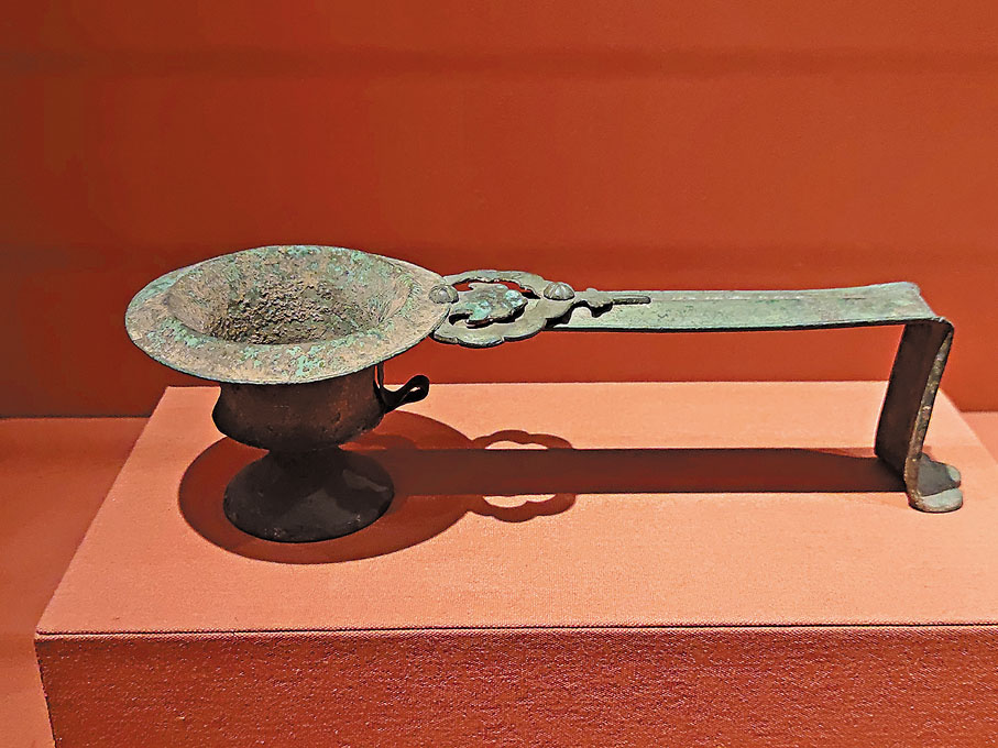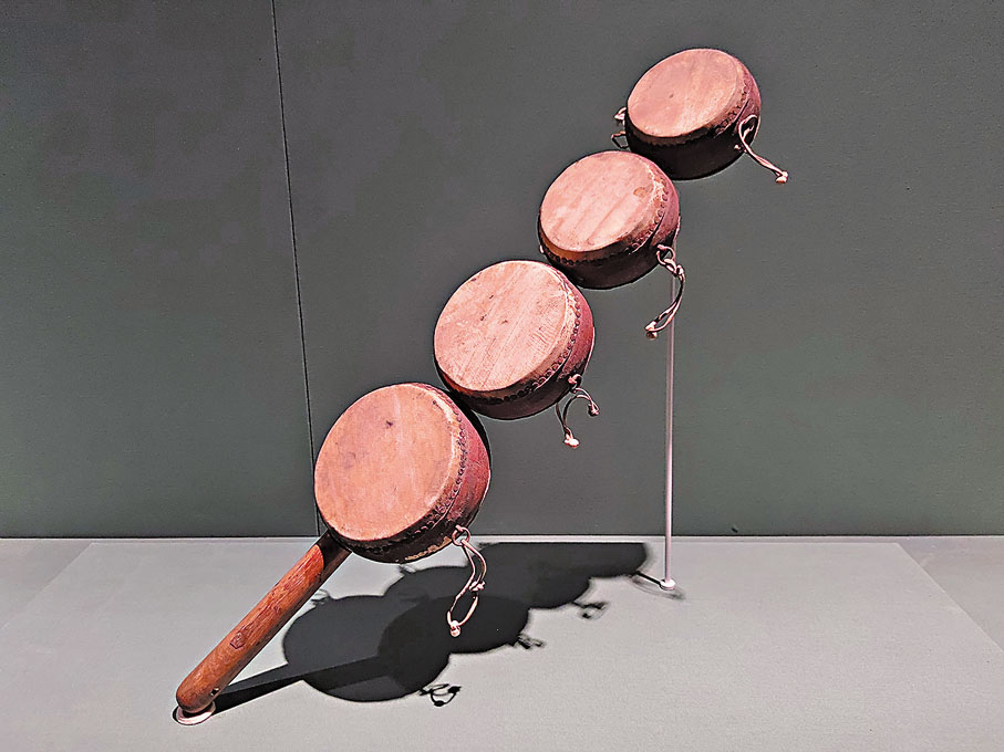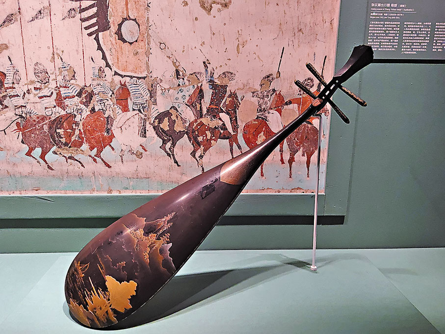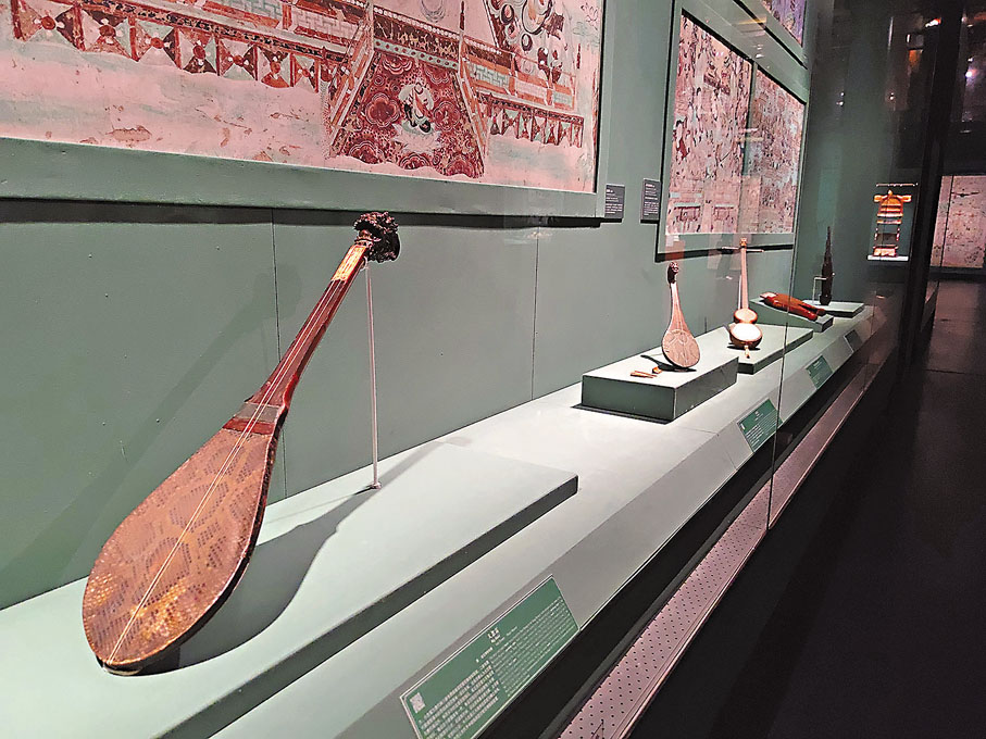 展覽特意做了一種「圖、物對應」,即根據敦煌壁畫中的形象在文物中尋找對應的實物。如敦煌石窟220窟北壁藥師經變中出現的一件樂器--方響,現場就展出了一件故宮博物院藏的方響。