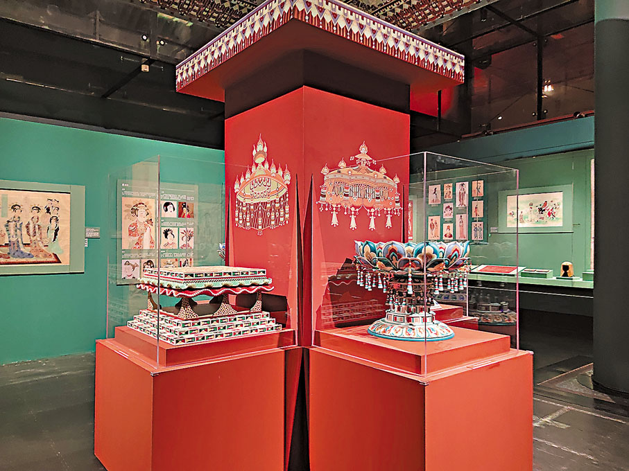 展覽注重以實物去佐證畫中所繪飾品、樂器、服飾等,如展覽現場就根據130窟的供養人的服飾做了實物復原,也將敦煌壁畫中漂亮的須彌座、華蓋、幔蓋等實物復原。