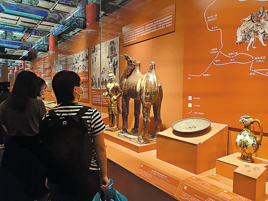 「絲路重華」單元由「絲路漫行」、「信念所成」、「莊嚴淨土」、「壁上丹青」四部分組成,以大量絲路文物、敦煌壁畫和雕塑臨摹作品展示絲路上的敦煌發展史、石窟的營建與壁畫雕塑藝術。其中展出的重點文物有「敦煌」簡(漢前202-公元220年),其於1980年敦煌漢長城千秋燧採集。墨書「敦煌」二字,漢隸書體。另有一塊漢簡中記錄着漢代驛站用十八擔粟,相當於486斤糧食,來餵烏孫國使團的馬。從數量推測,此次烏孫使者團十分龐大。這是史書沒有記載,卻實實在在發生在絲綢之路上的某一個瞬間。