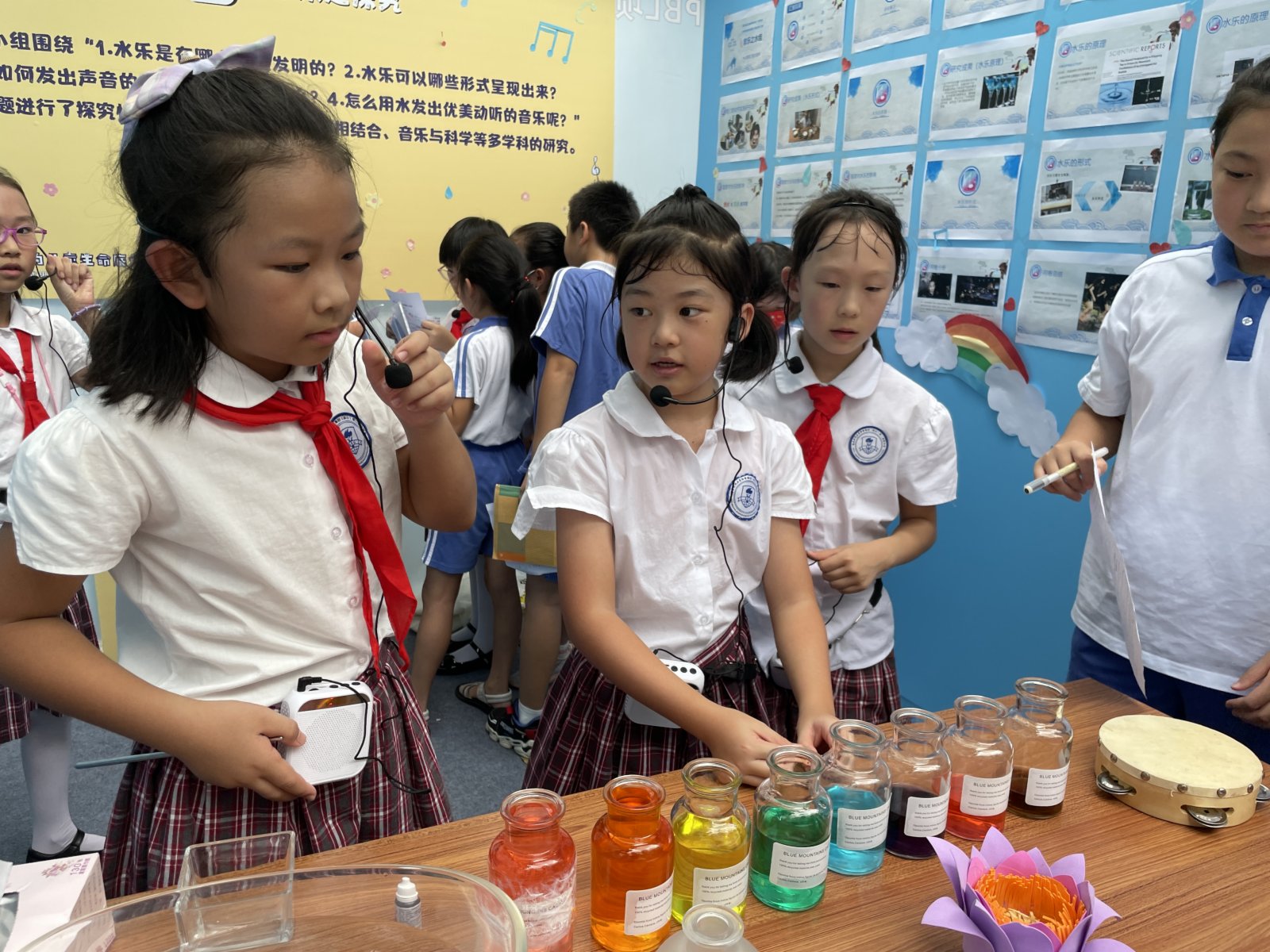 在「水的世界」項目展出現場,記者看到與水有關的項目琳琅滿目:水利水害之水資源利用、水的再生、水樂之探究、探究核廢水、水的壓力研究、水果裏的水……四年級的梁書涵與同學參與了「水樂之探究」項目,她用手中的棒子敲打着裝着不同水量的玻璃瓶子,於是,一首用水演奏的《歡樂頌》便飄揚在學校中。現場展板上貼滿了他們研究水樂的PPT總結,「我們在研究中得出的最重要的結論是水產生聲音的方法,一個瓶子裝上少量的水,它發出的聲音是高的,因為裏面有很多空氣,棒子敲打的過程中,空氣就會產生震動,聲音就高,反之則低。」梁書涵向其他同學介紹自己組的發現與成果。