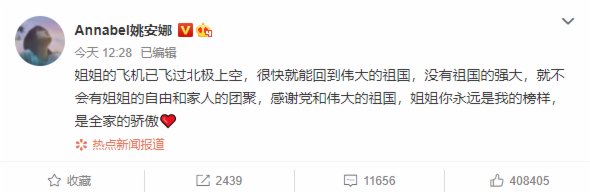 其同父異母妹妹姚安娜在其個人微博@Annabel姚安娜發聲稱:「姐姐的飛機已飛過北極上空,很快就能回到偉大的祖國,沒有祖國的強大,就不會有姐姐的自由和家人的團聚,感謝黨和偉大的祖國,姐姐你永遠是我的榜樣,是全家的驕傲。」