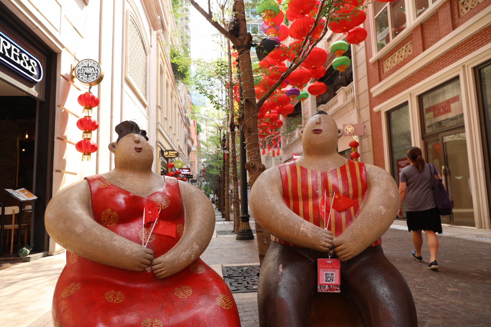 (大公文匯全媒體記者 李湃豐)國慶將至,香港街頭處處洋溢着濃鬱的國慶氛圍,100多面五星紅旗和香港特區區旗飄洋在香港利東街上空,形成一片壯闊的「旗海」令人歎為觀止,沿路的公仔也都手持國旗和區旗,吸引不少路人紛紛拿出手機合影留念。