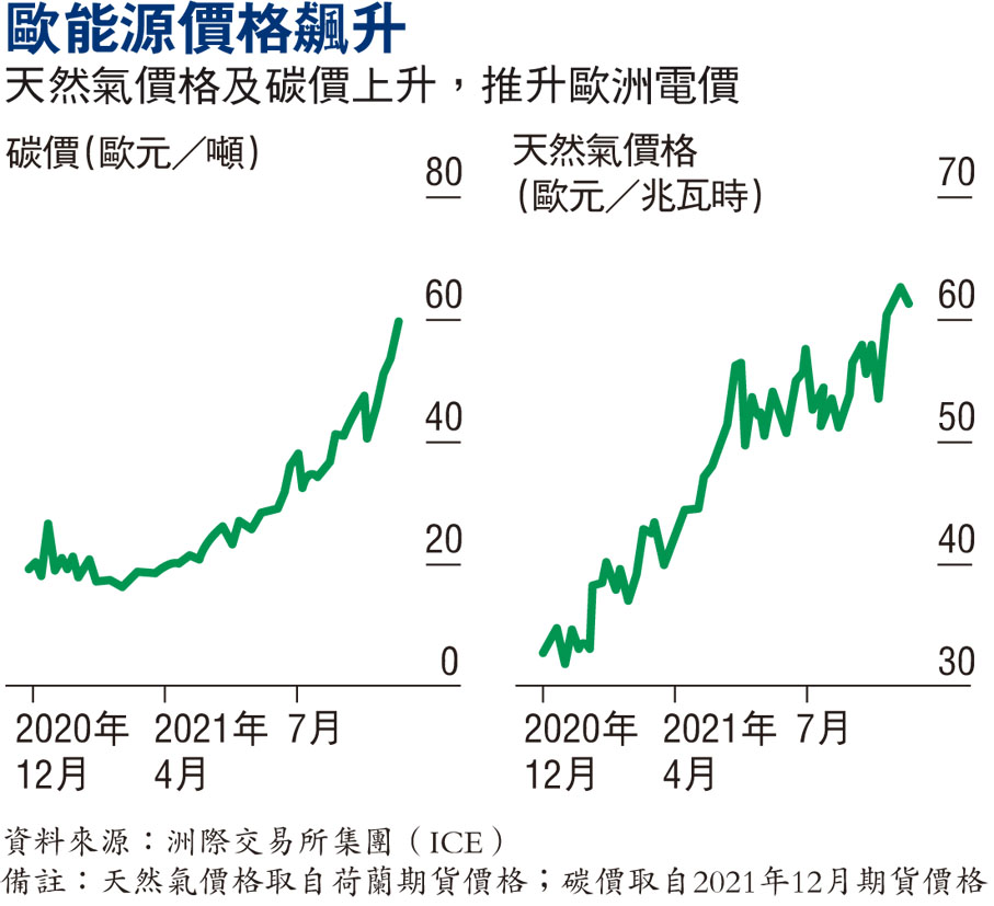 上述原因大致都涉及傳統經濟學上的供需問題,但歐洲今次能源危機之所以這麼嚴重還有一個更重要因素,就是碳交易制度的影響。歐盟為實現《京都協議書》的二氧化碳減排目標,2005年起建立碳排放交易體系,過去10年間,每噸二氧化碳排放許可的價格一直維持在5歐元(約45.3港元)左右,但近年歐盟不斷收緊排放政策,導致碳權(碳交易)價格不斷上漲,今年初已經升至30歐元(約271.9港元),到9月更超過60歐元(約543.8港元)。