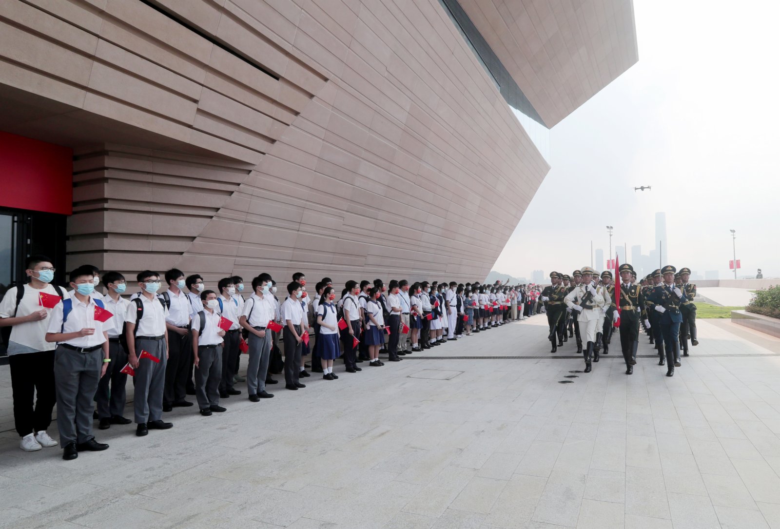 上午9時,香港師生和市民代表與駐軍官兵在展覽中心廣場整齊列隊,伴隨着雄壯的國歌聲,升國旗儀式開始,全場莊嚴肅立,高唱國歌,鮮艷的五星紅旗在維港之畔冉冉升起,迎風飄揚。