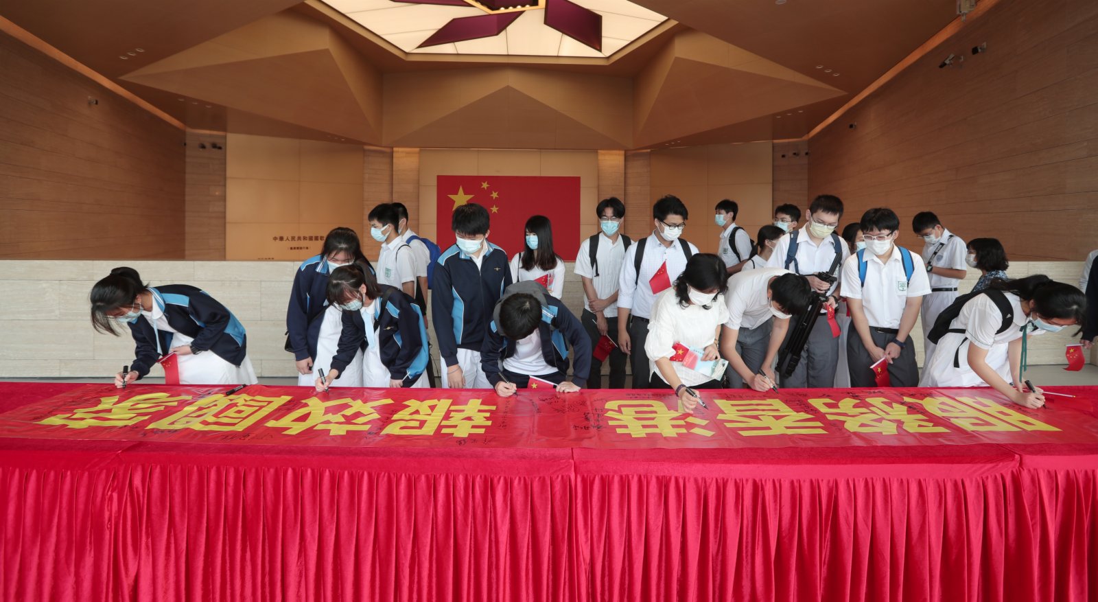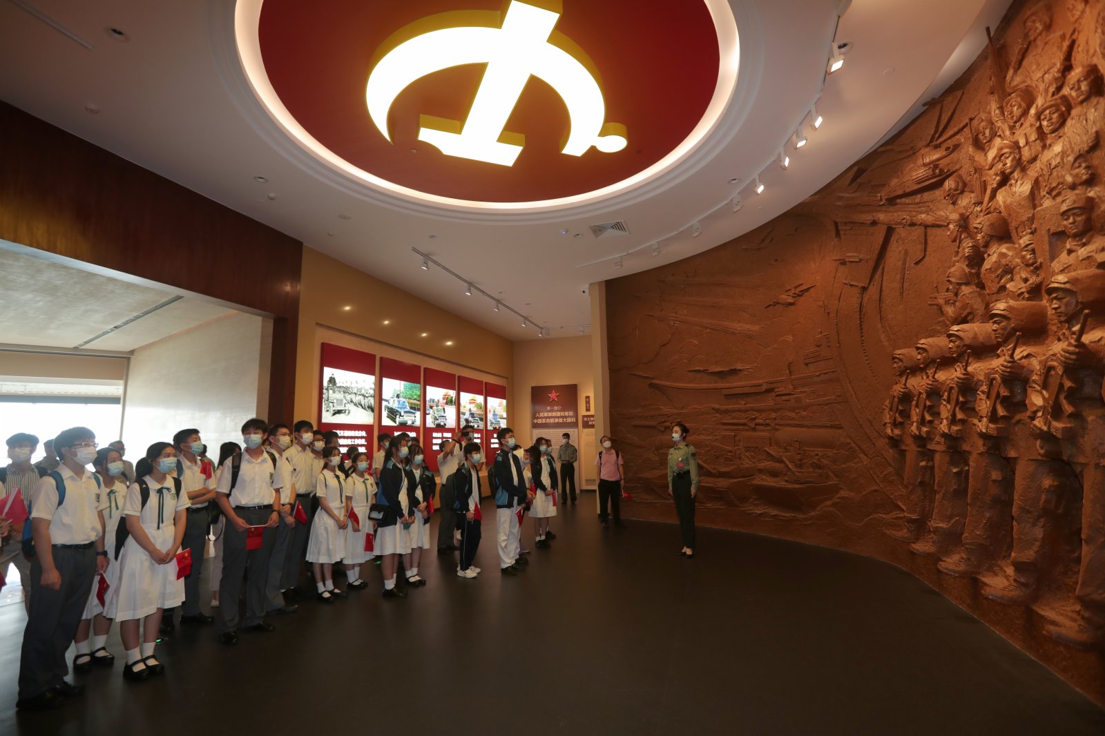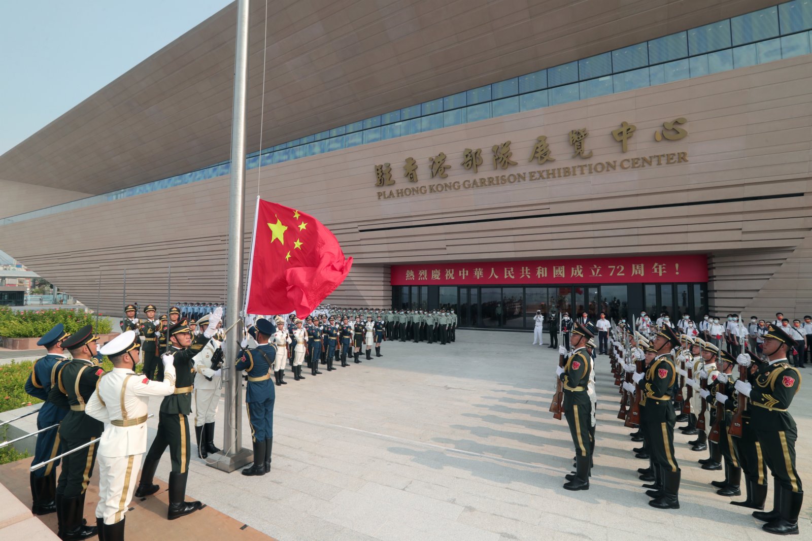 10月1日上午,來自香港漢華中學、培僑中學、香島中學、福建中學100餘名師生和市民代表,走進新建成的駐香港部隊展覽中心,參加升國旗儀式、參觀「夢起東方」主題展覽,開展愛國主義和國防教育,慶祝中華人民共和國成立72周年。